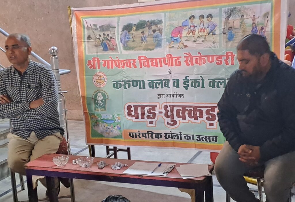 बीकानेर। गंगाशहर की श्री गोपेश्वर विद्यापीठ सैकेंडरी स्कूल के पारंपरिक खेल उत्सव “धाड़ – धुक्कड़” की शुरुआत सोमवार को हुई।विद्यापीठ के समन्वयक गिरिराज खैरीवाल ने मां सरस्वती के तस्वीर के समक्ष माल्यार्पण और अगरबत्ती प्रज्जवलित कर शुरुआत की। विद्यापीठ के करुणा क्लब और इको क्लब के तत्वावधान में राजस्थान राज्य भारत स्काउट व गाइड के स्थानीय संघ, गंगाशहर परिसर में 30 दिसंबर तक आयोज्य इस अद्भुत उत्सव के पहले दिन श्री गोपेश्वर विद्यापीठ स्कूल में टीमों का चयन किया गया। पूरी पारदर्शिता के साथ टीम चयन हुआ। नवाचारों के लिए प्रतिबद्ध विद्यापीठ के इस अभिनव आयाम में प्रत्येक टीम की दो दो उपटीम बनाई हैं। ये उप टीम्स पहले अपने ही ग्रुप की उपटीम से मैच खेलेगी। टीम चयन के पश्चात उनके कप्तान चुने गए। इसी तरह से ग्रुप भी आवंटित किए गए हैं। प्रत्येक ग्रुप के लीडर और सब लीडर एक एक स्टूडेंट होंगे। हर ग्रुप को प्रभारी के रूप में दो टीचर मार्गदर्शन देंगे। शुभारंभ के बाद 27 से 30 दिसम्बर 2022 तक के खेल कार्यक्रमों के बारे में शाला समन्वयक गिरिराज खैरीवाल ने विस्तार से जानकारी दी। शाला प्रधानाध्यापिका भंवरी देवी के मुताबिक इस अद्भुत आयोजन का उद्देश्य बच्चों को देश के प्राचीनतम और पारंपरिक खेलों से रूबरू कराना है। इस पांच दिवसीय आयोजन में सतोलियो, पैल दूज, मारदड़ी, कबड्डी, खोड़ियो खाती, कित कित, थूली गोथो, पकड़नी, बोरा रेस सहित अनेक पुराने लोकप्रिय खेलों के माध्यम से बच्चों को इन अद्भुत खेलों से जोड़ा जाएगा।