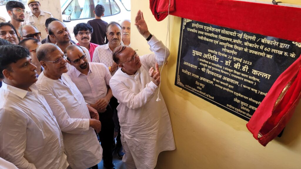 बीकानेर, 23 जुलाई। सज्जन लोगों द्वारा विद्या, धन और शक्ति का सकारात्मक उपयोग किया जाता है। हल्दीराम एज्यूकेशनल सोसाइटी ने इसी सिद्धांत का अनुसरण किया है और कई विद्यालयों में आमूलचूल बदलाव का बीड़ा उठाया है। ये बात राजस्थान के शिक्षा मंत्री डॉ. बी.डी. कल्ला ने 23 जुलाई 2023 को बीछवाल स्थित राजकीय उच्च माध्यमिक विद्यालय, बघिर में हल्दीराम एज्यूकेशनल सोसायटी द्वारा साठ लाख रुपए की लागत से करवाए गए नवीनीकरण कार्यों और अत्याधुनिक शिक्षण उपकरणों के लोकार्पण अवसर पर बतौर मुख्य अतिथि कही। उन्होंने कहा कि यह विशेष स्कूल है। यहां आधारभूत सुविधाओं तथा आधुनिक शिक्षण उपकरणों का उपलब्ध करवाना पुण्य का कार्य है। इससे विद्यार्थियों को सहूलियत होगी। शिक्षा मंत्री ने कहा कि शिक्षा ही व्यक्ति के विकास का माध्यम है। शिक्षा के बिना जीवन अधूरा होता है। हमें चाहिए कि प्रत्येक बच्चे को अधिक से अधिक पढ़ाएं। उन्होंने हल्दीराम एज्यूकेशनल सोसायटी द्वारा किए गए सामाजिक सरोकारों के कार्यों की सराहना की और कहा कि संस्था द्वारा चार स्कूलों को गोद लेकर वहां करोड़ों रुपए के कार्य करवाए गए हैं। यह विद्यार्थियों के लिए लाभदायक साबित होंगे। साथ ही अन्य भामाशाहों को प्रेरणा भी मिलेगी। उन्होंने कहा कि राज्य सरकार शिक्षा के विकास को लेकर संकल्पबद्धता के साथ कार्य कर रही है। मुख्यमंत्री श्री अशोक गहलोत के नेतृत्व में प्रदेश में तीन हजार से अधिक महात्मा गांधी अंग्रेजी माध्यम स्कूल खुल गए हैं। दो हजार विद्यालय और खोले जाने की तैयारी है। इससे शिक्षा में और अधिक गुणवत्ता आएगी। उन्होंने बताया कि प्रदेश के लगभग सभी सीनियर सेकेंडरी स्कूलों में आईसीटी लैब स्थापित कर दिए गए हैं। राज्य सरकार के प्रयासों से विद्यार्थियों को लाभ मिल रहा है। उन्होंने मुख्यमंत्री चिरंजीवी स्वास्थ्य बीमा योजना, कामधेनु पशु बीमा योजना, सौ यूनिट बिजली सहित राज्य सरकार की विभिन्न योजनाओं की जानकारी भी दी।
