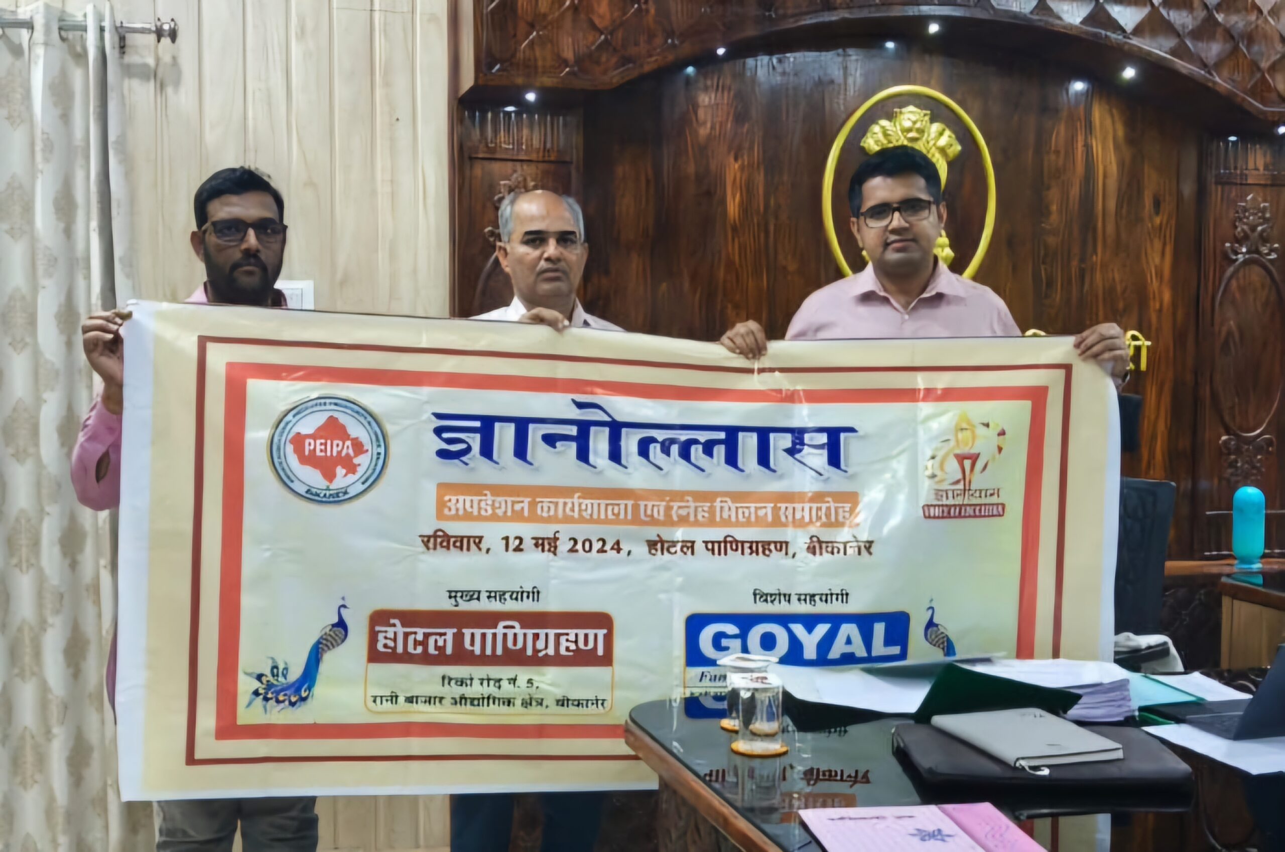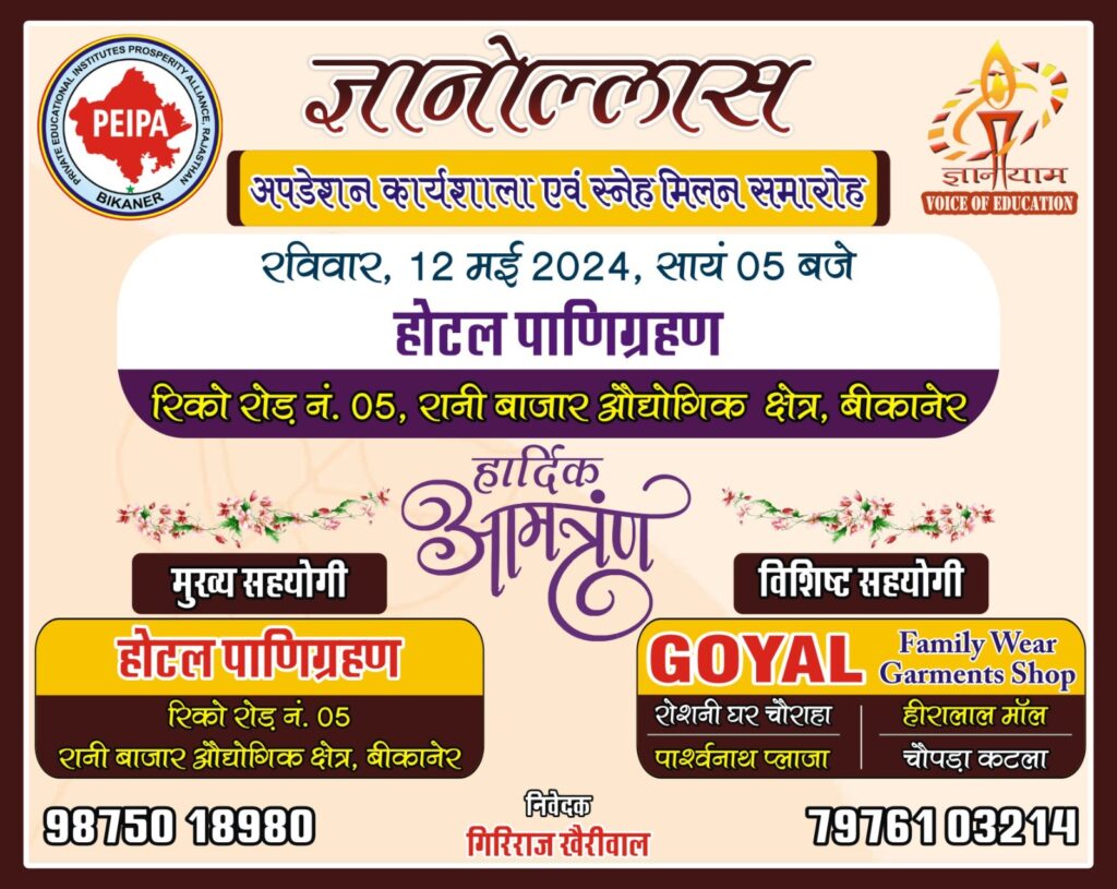 बीकानेर, 09 मई। प्राईवेट एज्यूकेशनल इंस्टीट्यूट्स प्रोसपैरिटी एलायंस (पैपा) एवं वॉयस आफ एज्यूकेशन “ज्ञानायाम” के संयुक्त तत्वावधान में 12 मई को होटल पाणिग्रहण में आयोज्य अपडेशन कार्यशाला एवं स्नेह मिलन समारोह “ज्ञानोल्लास” के बैनर का लोकार्पण बुधवार को जिला परिषद के सी ई ओ सोहनलाल, पैपा के प्रदेश समन्वयक गिरिराज खैरीवाल एवं लोकेश कुमार मोदी ने किया।