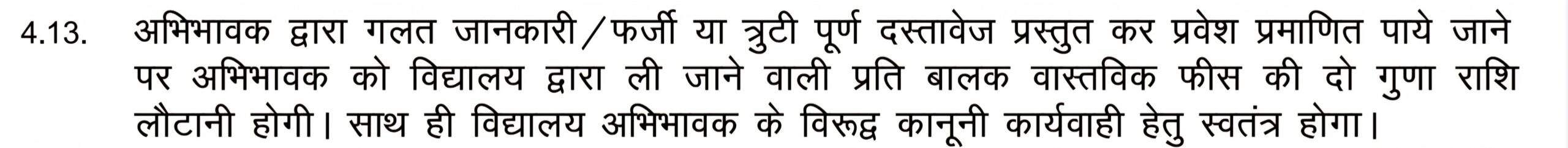 यदि किसी अभिभावक द्वारा प्रस्तुत दस्तावेज या जानकारी गलत या मिथ्या सिद्ध हो जाती है तो ऐसे अभिभावकों को संबंधित विद्यालय में उस विद्यालय द्वारा निर्धारित फीस का दुगुनी राशि चुकानी होगी तथा साथ ही स्कूल ऐसे अभिभावकों के विरुद्ध कानूनी कार्रवाई के लिए भी स्वतंत्र रहेगा। शिक्षा विभाग ने यह प्रावधान आरटीई के अंतर्गत जारी किए जाने वाले दिशा निर्देशों में जोड़ा है। सत्र 2026-27 हेतु जारी दिशा निर्देशों में पृष्ठ संख्या 8 पर बिन्दु संख्या 4.13 में इस प्रावधान को देखा जा सकता है।
